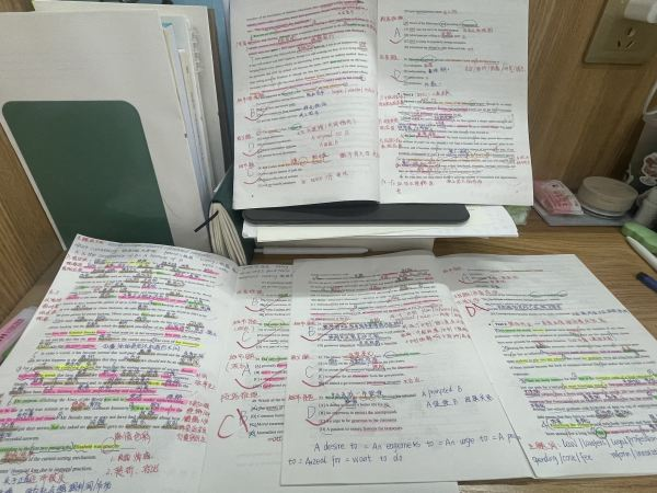 @初秋凉夕 的文字里记录了备考时最真实的窒息感。“开始做真题时,满眼的红叉像一盏盏亮起的红灯,堵死了前路。国庆节第五天,我在图书馆刷到了保研同学的旅行朋友圈,照片里明媚的笑容,映照着自己做不出真题的‘面如土色’,我倏然觉得好疲惫。 我逃回宿舍,瘫倒在床上,可一睁眼,看到的只有上铺的床板,上面贴满了数学公式和英语作文。”